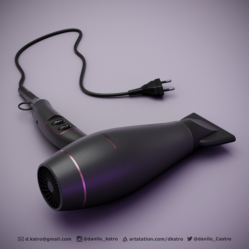 Hairdryer, 3D model, cable with curve control along with power plug for socket. 3D model ready for production with procedural textures made with the Blender node. If you wish to customize the project, the model has the UV mesh open in all parts of the model.