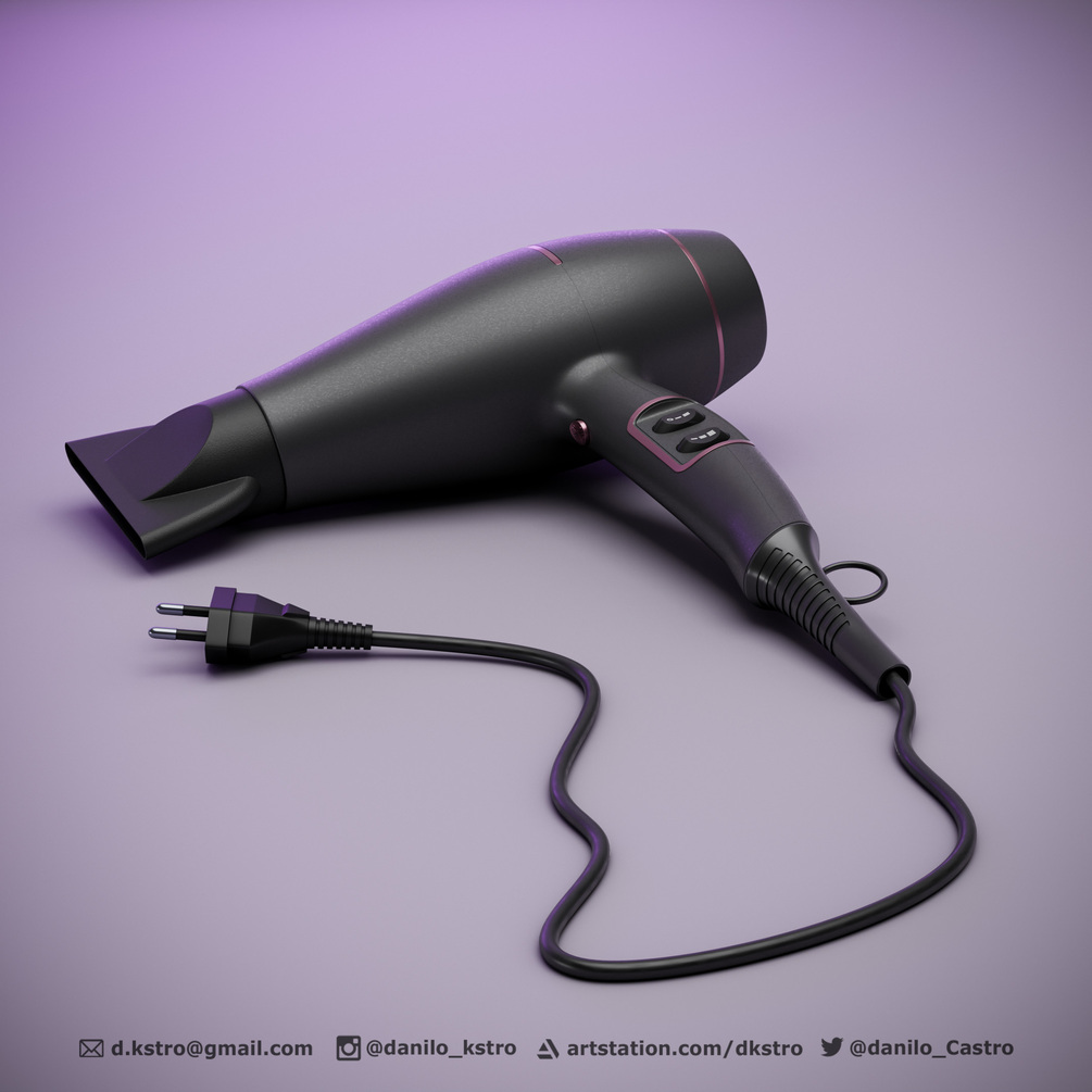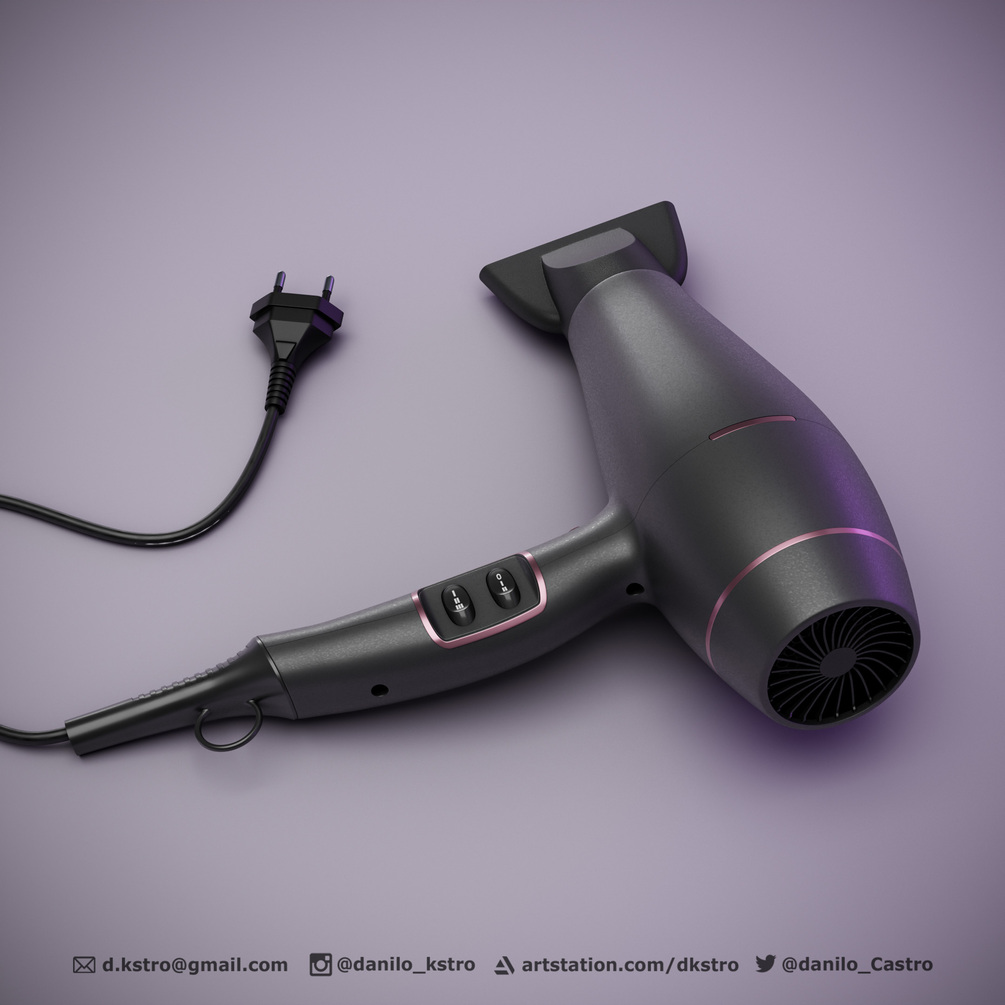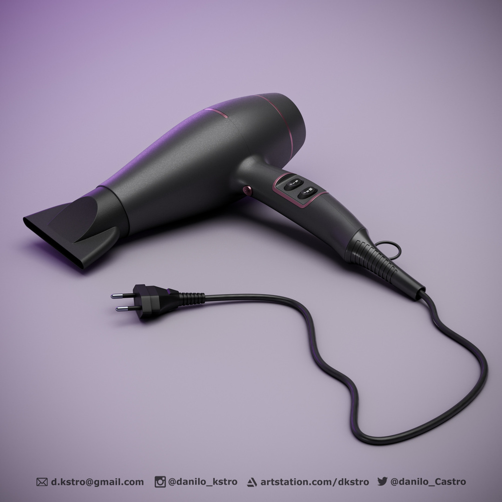 Hairdryer, 3D model, cable with curve control along with power plug for socket. 3D model ready for production with procedural textures made with the Blender node. If you wish to customize the project, the model has the UV mesh open in all parts of the model.